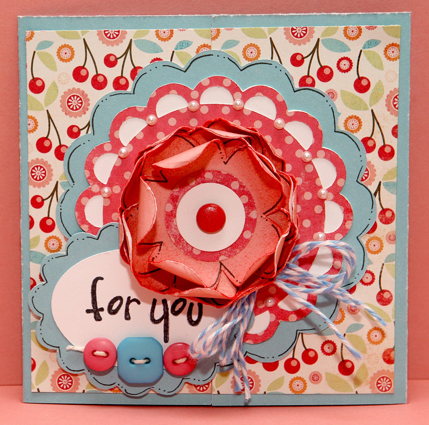 For my finishing touches, I sponged blush ink around the edges of the flowers, distressed and curled the edges, I then doodled black lines around the flowers and the bright blue scalloped circle and oval. I added two circle punches and brad to the center of flower, floss through the three buttons, tiny adhesive pearls around the pink scalloped circle and a twine bow, which is swimming pool color from Doodlebug.